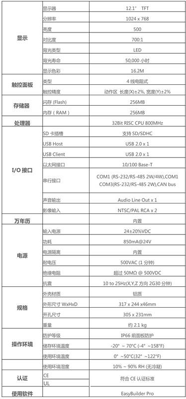 產(chǎn)品特點 Installation 鋁合金外殼搭配全新色彩與時尚設計 Video Input Ports 支持 NTSC 及 PAL 格式 12.1" 1024x768 TFT 工業(yè)級 LCD 無風扇冷卻系統(tǒng) 內置 256MB 儲存內存及萬年歷 NEMA4/IP66 面板防護等級 陶瓷封裝高壽命LED背光 SD 卡插槽支持 SD/SDHC 內置電源隔離防護器 Com1或Com3 RS485 2W 支持 MPI 187.5K CAN bus 裝置支持 CANopen 通訊協(xié)議 Com1 / Com3 RS485 及CAN bus 隔離器內置